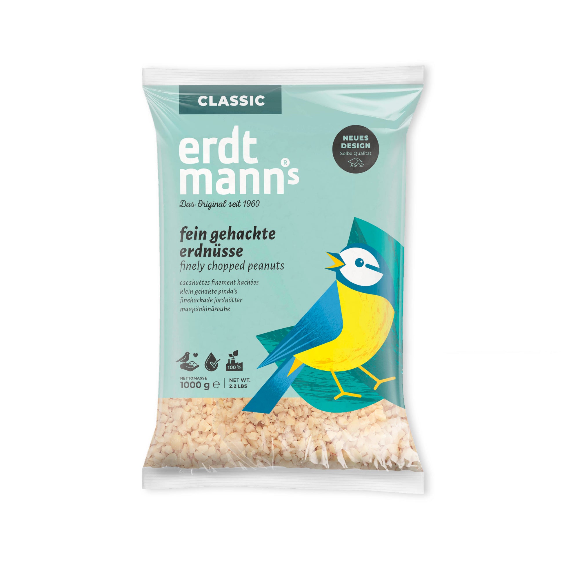 Fein gehackte Erdnüsse sind besonders delikat an der Futterstelle. Schnabelgerecht zugeschnitten sind sie besonders leicht zugänglich für alle Wildvogelarten und auch für Jungvögel von großem Wert. Sie sind eine gelungene Abwechslung an der Futterstelle. Ideal für Futterhäuschen, eine geschützte Bodenfutterstelle oder auch für den Balkon, da das Futter keine Rückstände hinterlässt. Auch für Eichhörnchen geeignet.